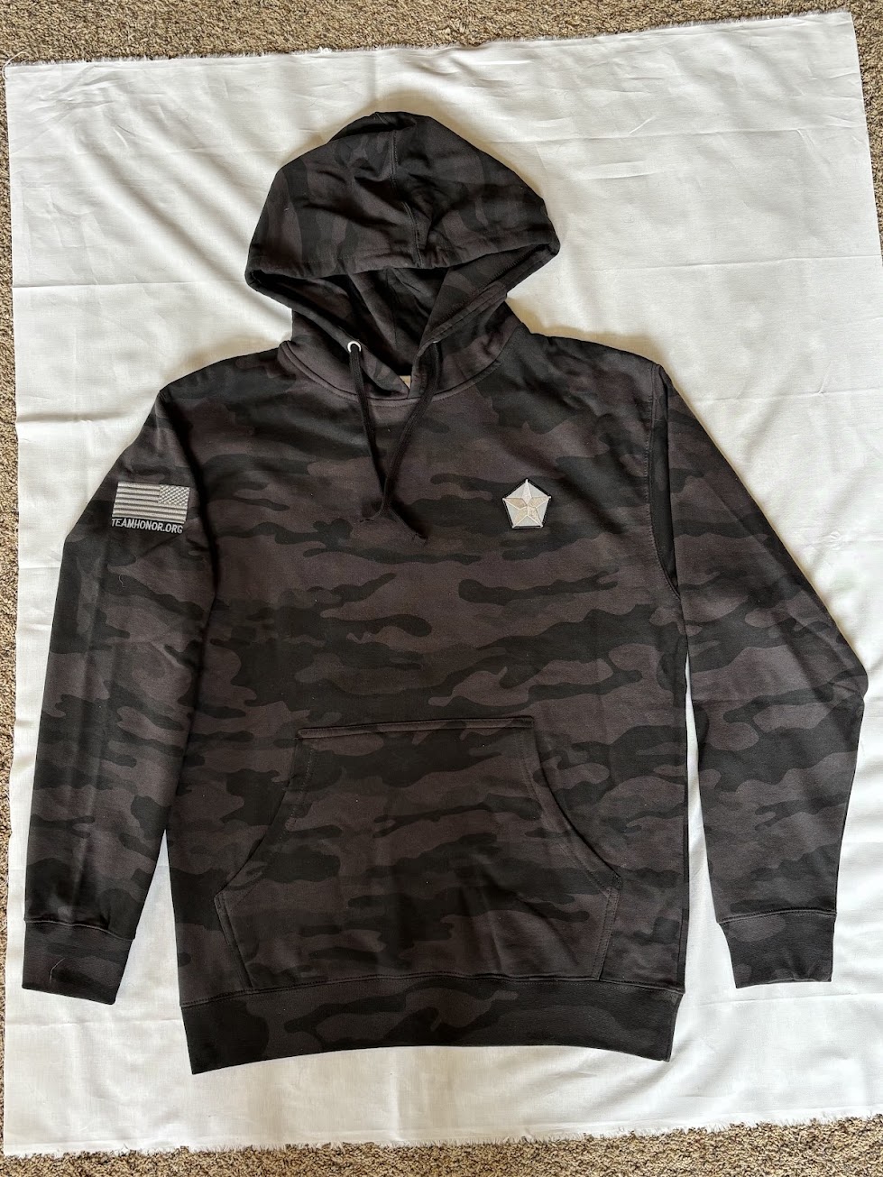 Stay warm in this limited-edition black camo hooded sweatshirt, containing a special edition Team Star on the chest. Flag and Team website on sleeve.