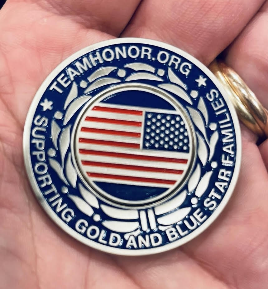 1 ¾” Team Honor Challenge Coin containing Team Logo on front, with Team Website, and American Flag Ball Market on back.