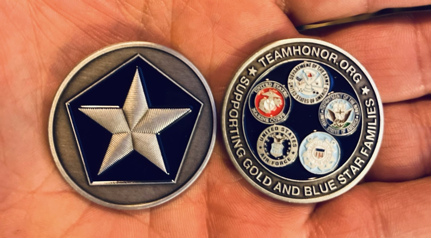 1 ½” Team Honor Challenge Coin containing the Team Logo on front, with Branches of Service and Team Website on back.